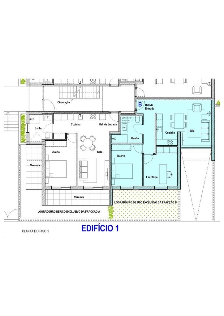 Segundo o projeto de arquitetura a fração B tem as fachadas orientadas a Norte e Oeste, e é composta por um espaço amplo destinado a hall de entrada, cozinha e sala, um quarto, um escritório, uma instalação sanitária e logradouro